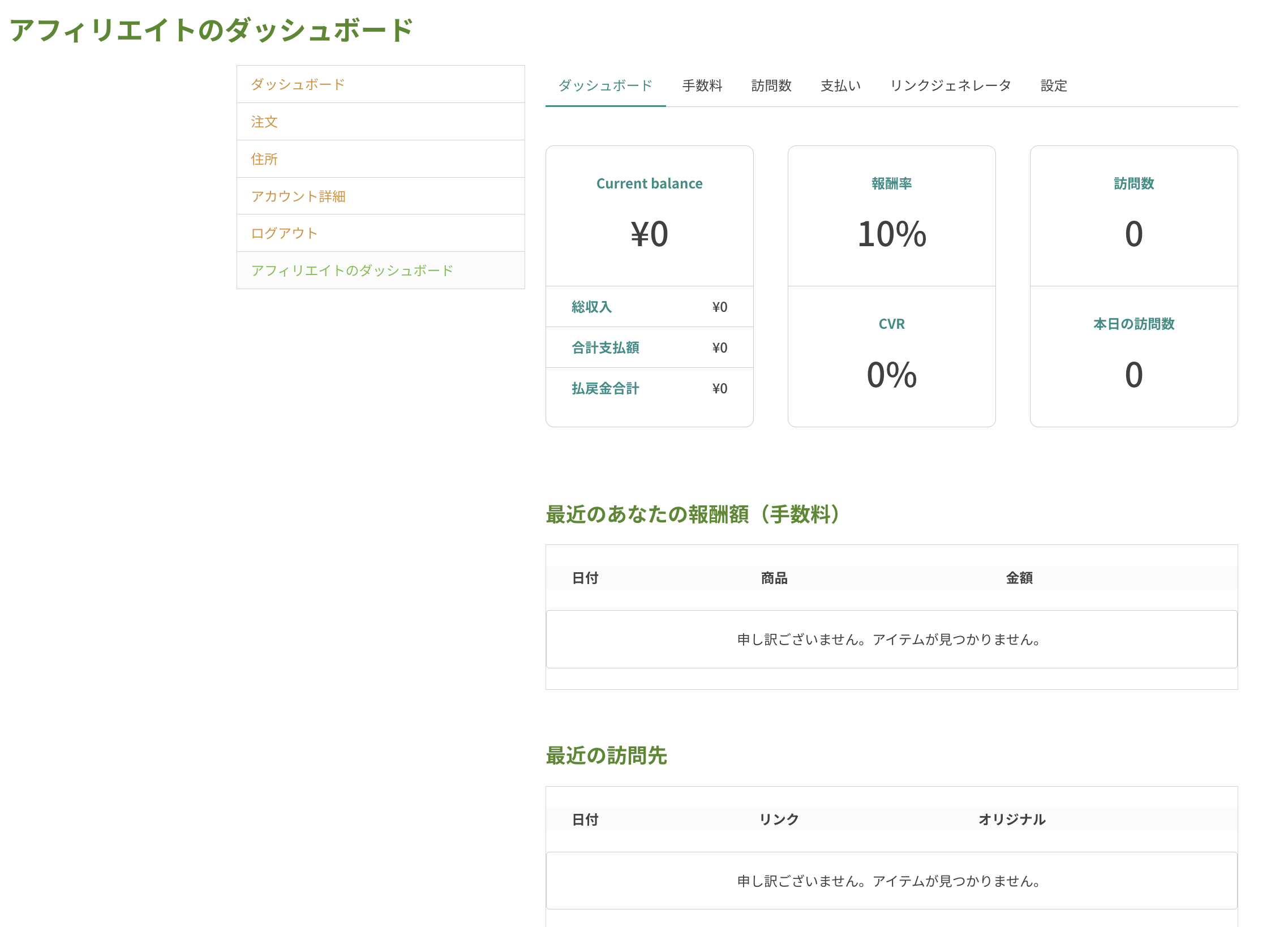 アフィリエイトとして登録されたユーザーは専用のダッシュボードが提供されます。